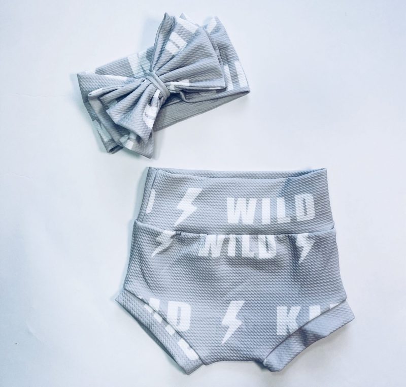 הדפס מדליק של WILD וברקים על רקע בז׳-אפור בהיר.